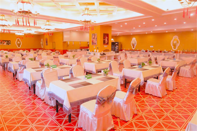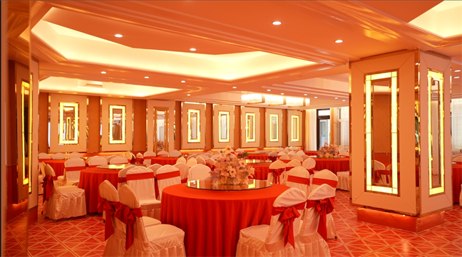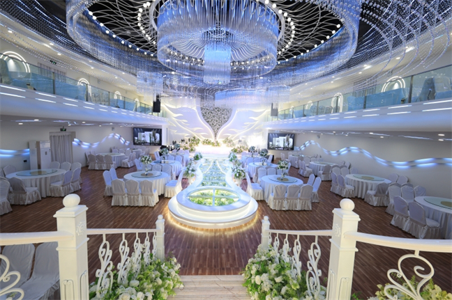 皇宮廳—金碧輝煌、皇宮式裝修,面積1038㎡,層高8.6米,配備愛情階梯、軌道威亞、二層觀禮臺、浪漫燈光秀、旋轉升降舞臺、頭頂天幕連接開合大屏。可承接50桌的大型宴會,也可舉辦600人的大型會議;還可用作會展、車展場地,每逢節假日還為市民上演文藝節目。